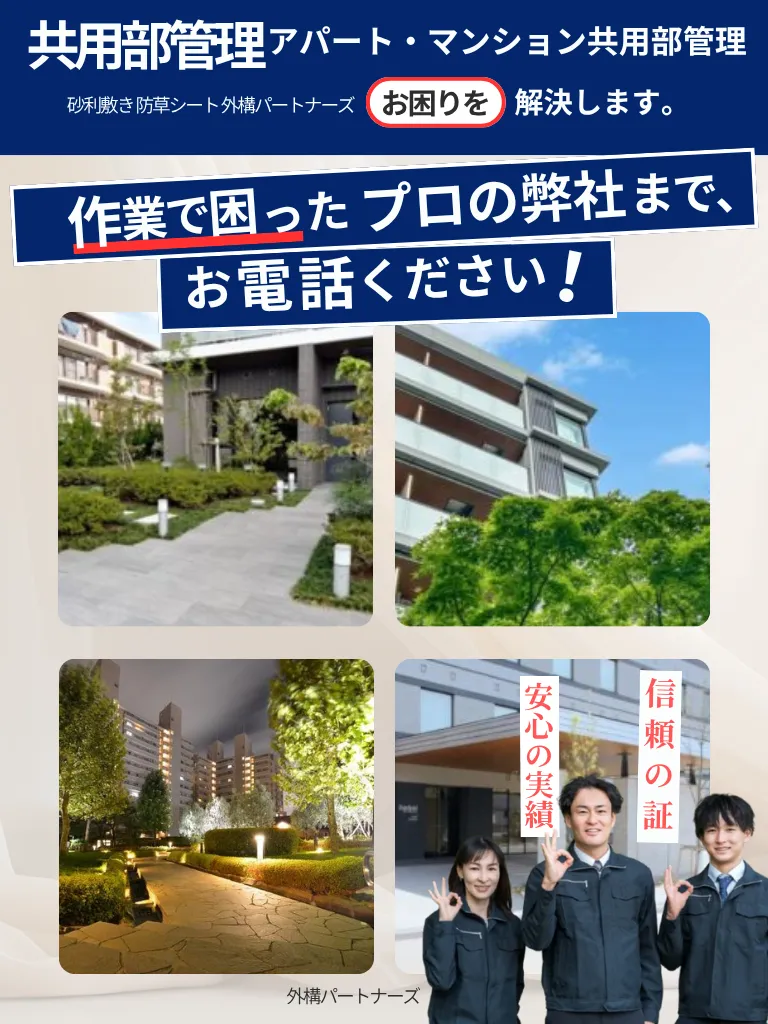 共用通路、駐輪場、植栽スペースの雑草管理を効率化。物件の美観を保ち、入居者様の満足度と資産価値を維持します。