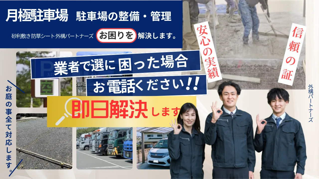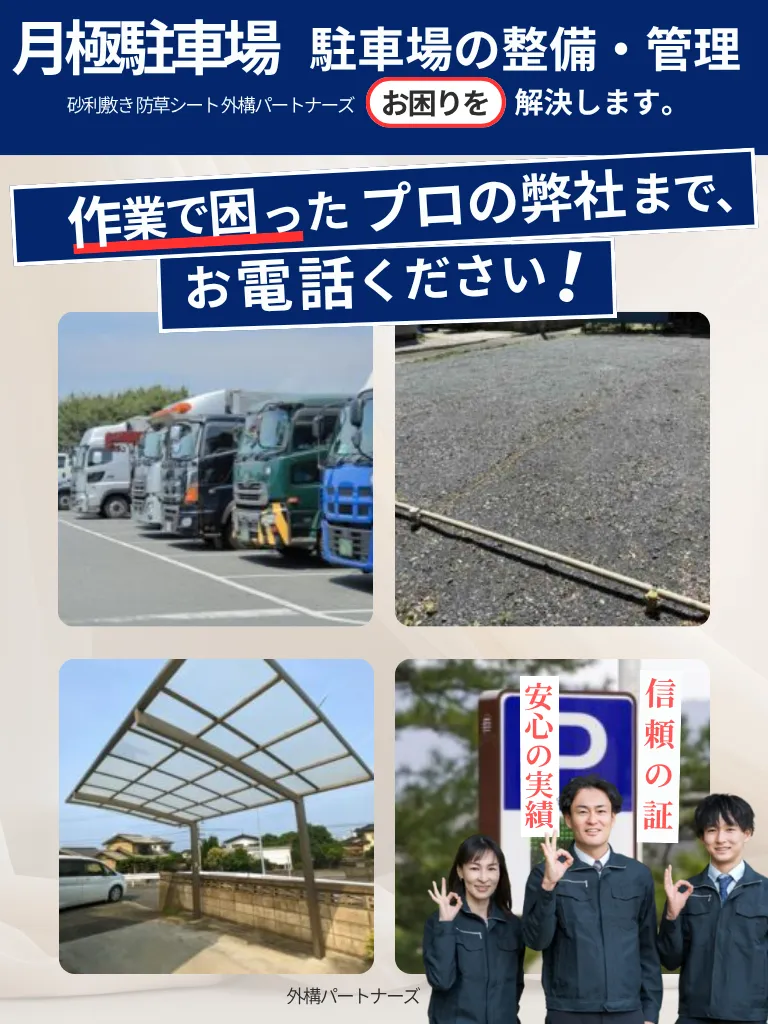 | 業務内容 | ・月極駐車場、施設駐車場の年間管理 ・駐車場の機械草刈り、除草剤散布 ・防草シート施工、砂利敷き、アスファルト補修 ・区画ライン引き、車止め設置 ・看板設置、フェンス補修 ・空き地、遊休地の整備・管理 ・外構、エクステリア工事全般 |