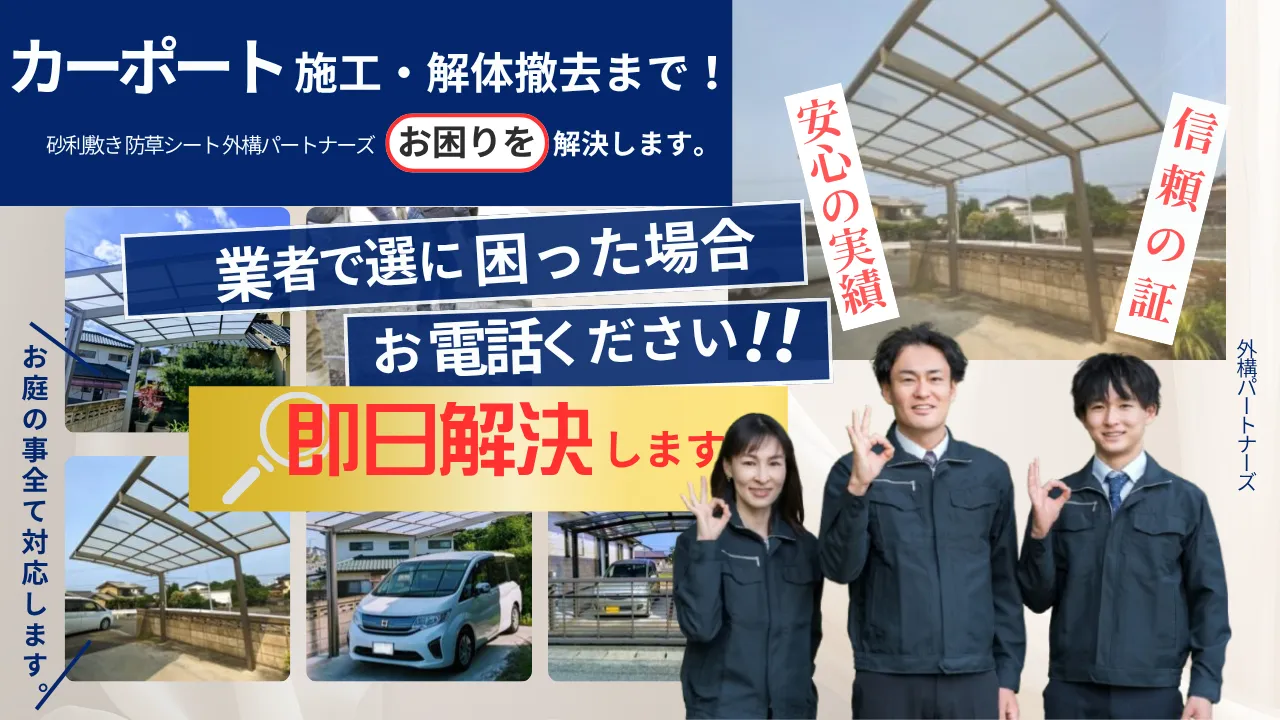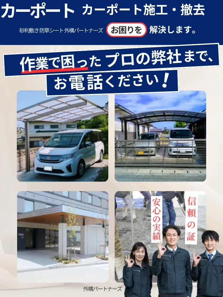 | 業務内容 | ・カーポート、サイクルポートの設計・施工 ・テラス、ウッドデッキ、フェンス等のエクステリア工事 ・駐車場のコンクリート、アスファルト舗装工事 ・防草シート、砂利敷き、砕石敷きの設計・施工 ・外構、造園工事全般 ・既存工作物の解体・撤去 |