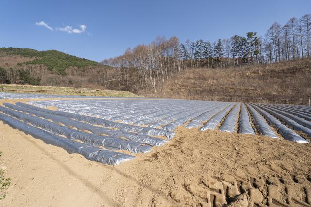 作物を育てるエリア以外の通路部分などに防草シートを施工。面倒な草取り作業を軽減し、農作業に集中できる環境を作ります。